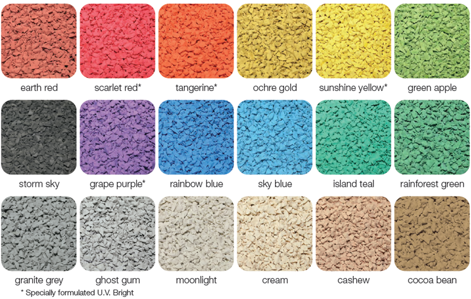 Our wetpour rubber surfaces come in this exciting range of colours.